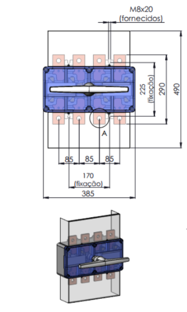 | Seção dos condutores de conexão – cabos com terminal – barras – torque no parafuso de conexão (+-10%) – parafusos dos terminais (Sextavado) | (2X)30x5mm 60Nm M16x50 | ||