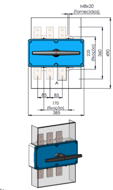 | Seção dos condutores de conexão – cabos com terminal – barras – torque no parafuso de conexão (+-10%) – parafusos dos terminais (Sextavado) | (2x) 60x10mm 40Nm (2x) M12x50 | ||