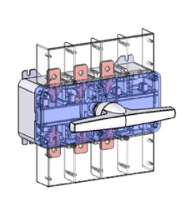 Seccionadora-interruptora 3 polos e corrente nominal de 630A modelo KNS13/630 qualifica-se por sua operação sob carga. A velocidade de manobra da chave independe do operador, em qualquer posicionamento de montagem. O corpo das chaves é prensado em poliéster reforçado com fibra de vidro, formando com a tampa uma unidade totalmente fechada.